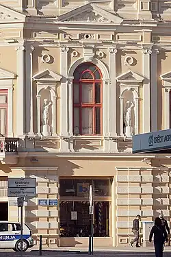 Le bâtiment a été construit à l'angle des rues Masarikova et Gospodar Jevremova[2]. La façade façade d'angle est dotée d'un large portail ouvrant sur l'espace commercial du rez-de-chaussée ; ce portail est surmonté d'un balcon[2]. Cette façade était dominée par un dôme, qui a été détruit pendant la Seconde Guerre mondiale[2]. En revanche quatre statues placées dans des niches, représentant la déesse Flore, ornent les façades à gauche et à droite de la façade angulaire et encadrent une haute fenêtre cintrée[2].