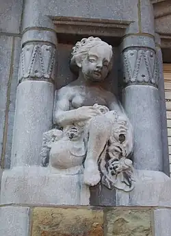 De part et d'autre de la baie en triplet, deux petites niches entourées de colonnettes sculptées sont occupées par de jeunes enfants tenant dans leurs mains des fruits et des fleurs. Une jambe et un pied de chaque bambin débordent du cadre de la niche.