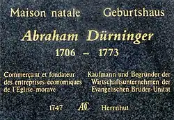 Abraham Dürninger, commerçant et fondateur des entreprises économiques de l'Église morave[3], naît dans cette maison en 1706, cependant la nouvelle façade de style Régence[4] est postérieure à sa naissance (1748).