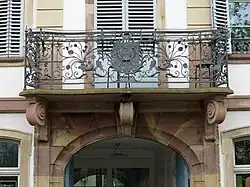 Le balcon en ferronnerie est soutenu par des cornes d'abondance et porte les armes des Fürstenberg : François-Egon de Fürstenberg et son frère Guillaume-Egon de Fürstenberg furent tous deux évêques de Strasbourg à la fin du XVIIe siècle.