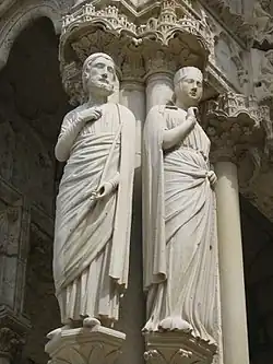 Un hommage est rendu à la comtesse Mathilde de Dammartin-en-Goële, comtesse d'Aumale, comtesse de Boulogne, et à son époux Son Altesse Royale Prince Philippe Ier dit le Hérissé dit Hurepel de France (Capétien), comte de Clermont-en-Beauvaisis, sur la façade de la cathédrale Notre-Dame de Chartres, porche nord, portail central, statues de gauche.