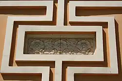 La façade principale est organisée symétriquement autour d'une grande avancée centrale demi-circulaire qui dispose de trois hauts portails vitrés ; au rez-de-chaussée comme à l'étage, de part et d'autre de l'avancée centrale, les fenêtres sont regroupées deux à deux[4] dans un cadre rectangulaire ; entre le rez-de-chaussée et l'étage se trouvent également des cadres rectangulaires incluant des motifs floraux ; ces cadres décoratifs sont reliés à ceux qui entourent les fenêtres. Des pilastres rythment la façade sur toute sa hauteur[4].