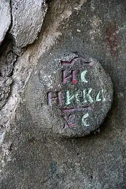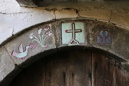 La décoration met particulièrement en valeur l'arche de la porte du sous-sol, sur laquelle sont représentés un oiseau et une grappe de raisin ainsi qu'une rosace aux initiales chrétiennes[3].