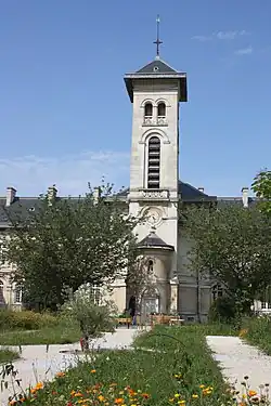 Au milieu du corps de logis se trouve la chapelle à nef unique divisée en trois travées. Six hautes fenêtres cintrées illuminent l'intérieur, qui se termine par une abside semi-circulaire. Elle est suivie d'un clocher élancé, à travers lequel un passage mène au jardin.