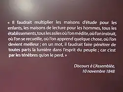 « Victor Hugo est né dans cette maison le 26 février 1802. Cette dédicace dévoilée le 25 février 2002 rappelle au XXIe siècle l'actualité des idéaux et des combats politiques du plus célèbre écrivain de France. Je veux les peuples grands, je veux les hommes libres. »