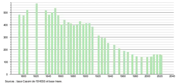 L'évolution du nombre d'habitants est connue à travers les recensements de la population effectués dans la commune depuis 1793. Pour les communes de moins de 10 000 habitants, une enquête de recensement portant sur toute la population est réalisée tous les cinq ans, les populations de référence des années intermédiaires étant quant à elles estimées par interpolation ou extrapolation[18]. Pour la commune, le premier recensement exhaustif entrant dans le cadre du nouveau dispositif a été réalisé en 2005[19].