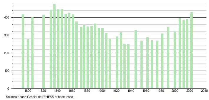 L'évolution du nombre d'habitants est connue à travers les recensements de la population effectués dans la commune depuis 1793. Pour les communes de moins de 10 000 habitants, une enquête de recensement portant sur toute la population est réalisée tous les cinq ans, les populations de référence des années intermédiaires étant quant à elles estimées par interpolation ou extrapolation[27]. Pour la commune, le premier recensement exhaustif entrant dans le cadre du nouveau dispositif a été réalisé en 2006[28].