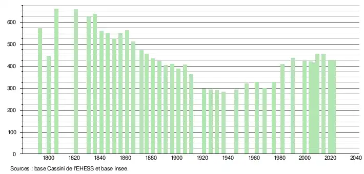 L'évolution du nombre d'habitants est connue à travers les recensements de la population effectués dans la commune depuis 1793. Pour les communes de moins de 10 000 habitants, une enquête de recensement portant sur toute la population est réalisée tous les cinq ans, les populations de référence des années intermédiaires étant quant à elles estimées par interpolation ou extrapolation[17]. Pour la commune, le premier recensement exhaustif entrant dans le cadre du nouveau dispositif a été réalisé en 2004[18].
