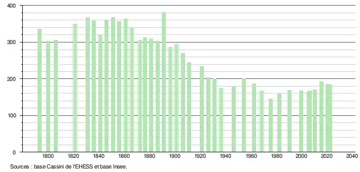 L'évolution du nombre d'habitants est connue à travers les recensements de la population effectués dans la commune depuis 1793. Pour les communes de moins de 10 000 habitants, une enquête de recensement portant sur toute la population est réalisée tous les cinq ans, les populations de référence des années intermédiaires étant quant à elles estimées par interpolation ou extrapolation[15]. Pour la commune, le premier recensement exhaustif entrant dans le cadre du nouveau dispositif a été réalisé en 2005[16].