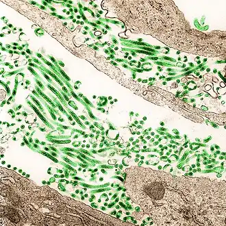 Il n'existe pas encore de vaccin ni de traitement spécifique homologué[6],[7], bien que plusieurs d'entre eux soient localement en cours d'essais cliniques sous le contrôle de l'OMS contre l'épidémie apparue en Afrique de l'Ouest en 2014, tels que le cAd3-ZEBOV, le VSV-EBOV, le favipiravir (Avigan), ou encore le brincidofovir. La prise en charge des personnes atteintes repose avant tout sur des soins palliatifs intensifs. Le virus se transmet à l'homme à partir d'animaux sauvages et circule ensuite au sein des populations humaines par contact avec les fluides corporels de personnes présentant les symptômes de la maladie (à l'issue de la période d'incubation), voire par voie entérale[8], mais pas par aérosols (voie aérienne)[9]. Des chercheurs pensent que des chauves-souris frugivores de la famille des ptéropodidés constituent le réservoir naturel du virus Ebola[7],[10], bien que les porcs aient été également impliqués dans la transmission d'un virus de même type[11].