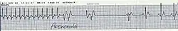 Tachycardie supraventriculaire par rythme réciproque au niveau du nœud atrioventriculaire. En jaune les ondes P juste derrière les complexes QRS.