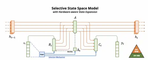 Mamba appartient à une famille élargie de modèles à espace d'états structurés (Structured State Space Models, SSM), une catégorie de réseaux neuronaux séquentiels inspirée des systèmes dynamiques linéaires[1]. Contrairement aux Transformers, Mamba remplace le mécanisme d'attention et les couches de perceptrons multicouches par un bloc SSM unifié, réduisant la complexité computationnelle de à pour la génération de séquences[1]. Cette approche repose sur une sélectivité dynamique : le modèle adapte ses paramètres (matrices , , et le pas discret ) en fonction des données d'entrée, filtrant les informations non pertinentes tout en conservant les contextes critiques[2].
