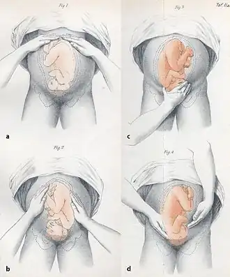 - ↑ B. Bates et L. S. Bickley, Guide de l'examen clinique - nouvelle édition 2014, Arnette - John Libbey Eurotext, (ISBN 978-2-7184-1362-4, lire en ligne), Techniques d'examen, « Techniques spéciales : Manœuvres de Léopold », p. 930