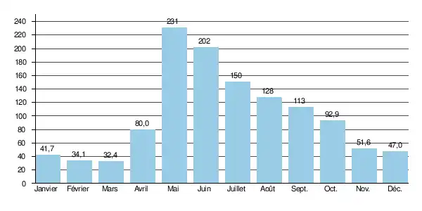 Sur la période d'observation de 52 ans, le débit mensuel minimal a été de 17,7 m3/s en , tandis que le débit mensuel maximal s'est élevé à 479 m3/s en .