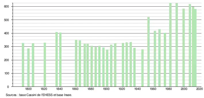 L'évolution du nombre d'habitants est connue à travers les recensements de la population effectués dans la commune depuis 1793. À partir du , les populations légales des communes sont publiées annuellement dans le cadre d'un recensement qui repose désormais sur une collecte d'information annuelle, concernant successivement tous les territoires communaux au cours d'une période de cinq ans. Pour les communes de moins de 10 000 habitants, une enquête de recensement portant sur toute la population est réalisée tous les cinq ans, les populations légales des années intermédiaires étant quant à elles estimées par interpolation ou extrapolation[2]. Pour la commune, le premier recensement exhaustif entrant dans le cadre du nouveau dispositif a été réalisé en 2007[3],[Note 1].