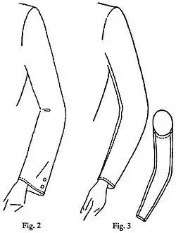 - Manche ajustée ou coudée : manche d’une seule partie mise en forme suivant le bras. La forme est faite par une pince à hauteur du coude ou du poignet.
