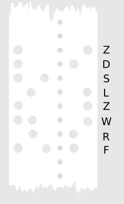 Section de ruban perforé montrant comment un mot de 40 bits était représenté sous la forme de 8 caractères de 5 bits (ITA2)