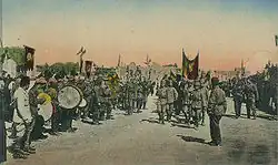 Le général Mariano Goybet et les troupes françaises entrent à Damas le . Au Liban, les hommes du général Gouraud ont été accueillis en libérateurs par la communauté maronite, mais en Syrie, les Français se heurtent à une forte opposition[19]. Dans une déclaration publiée en 1920, le général Gouraud expose sans ambiguïté sa politique à l'égard de la Syrie,