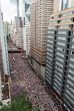 La participation de la manifestation dépassa les prévisions de la police. Initialement, la police réserva les voies de direction ouest seulement pour les manifestants, ce qui n'a pas suffi. Les manifestants demandèrent d'ouvrir les voies de circulation restantes pour faciliter la manifestation. À cause de la circulation lente et de la participation massive, la manifestation s'étendit aussi dans la direction opposée jusqu'à la rue Tin-Chong au Point-Nord, à l'Est de départ de la manifestation[42] tandis que la marche se dirigeait vers l'Ouest. La police ouvrit finalement les voies de circulations restantes et le chemin Hennessey fut rempli par les manifestants.