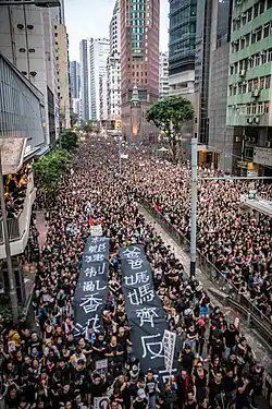 Le mouvement contre l'amendement de la loi d'extradition par le gouvernement de Hong Kong (en anglais : Anti-Extradition Bill Protests ; en chinois traditionnel : 反對逃犯條例修訂草案遊行與示威, familièrement 反送中[4]運動) est une série de manifestations à Hong Kong qui a duré de mars 2019 à mai 2020, et dans plusieurs autres villes autour du monde dans lesquelles on retrouve une diaspora hongkongaise. Les manifestants demandaient le retrait de l'amendement car ils considèrent qu'il permettra à la Chine continentale d'intervenir dans le système juridique indépendant, menaçant le particularisme légal de la région ainsi que la sécurité personnelle des habitants et de toutes les personnes passant par Hong Kong. En plus des manifestations locales, les communautés de la diaspora ont organisé des rassemblements et des manifestations de solidarité. Le mouvement se revendiquait sans leader et dépourvu d'organisateur centralisé. Les citoyens hongkongais communiquaient et organisaient les manifestations en utilisant notamment le forum LIHKG et l'application Telegram.