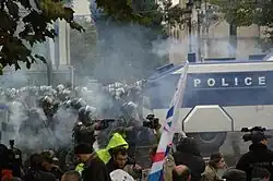 Des images télévisées montrent des manifestants lançant des pierres sur des policiers antiémeute. Ils sont dispersés une seconde fois par la police[31].