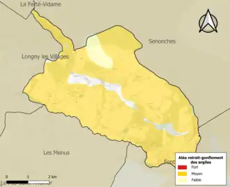 Le retrait-gonflement des sols argileux est susceptible d'engendrer des dommages importants aux bâtiments en cas d’alternance de périodes de sécheresse et de pluie. 90,7 % de la superficie communale est en aléa moyen ou fort (52,8 % au niveau départemental et 48,5 % au niveau national). Sur les 340 bâtiments dénombrés sur la commune en 2019, 316 sont en aléa moyen ou fort, soit 93 %, à comparer aux 70 % au niveau départemental et 54 % au niveau national. Une cartographie de l'exposition du territoire national au retrait gonflement des sols argileux est disponible sur le site du BRGM[15],[Carte 2].
