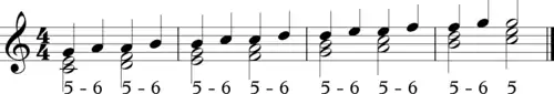 La marche ascendante en 5-6, comme la marche de quintes ascendantes, est une montée par paliers. Elle suit un modèle de mouvement de la racine d'une tierce vers le bas (généralement vers un accord de première inversion partageant la même note de basse que la première note) suivi d'un mouvement de la racine vers le haut d'une quarte. Cela se fait souvent en alternant la position de la fondamentale et les accords de premier renversement. La basse chiffrée est la même que la séquence descendante en 5-6, mais la basse elle-même suit un motif ascendant plutôt que descendant[6].