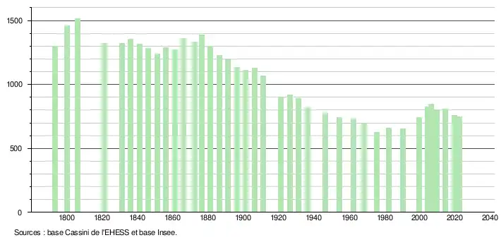 L'évolution du nombre d'habitants est connue à travers les recensements de la population effectués dans la commune depuis 1793. Pour les communes de moins de 10 000 habitants, une enquête de recensement portant sur toute la population est réalisée tous les cinq ans, les populations de référence des années intermédiaires étant quant à elles estimées par interpolation ou extrapolation[21]. Pour la commune, le premier recensement exhaustif entrant dans le cadre du nouveau dispositif a été réalisé en 2004[22].