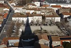 Vue aérienne du centre-ville avec l'église Saint-Pierre et les places de Verdun et Chasseloup-Laubat. | |||||