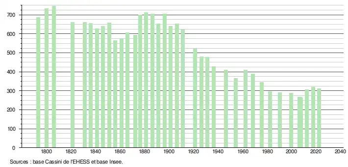 L'évolution du nombre d'habitants est connue à travers les recensements de la population effectués dans la commune depuis 1793. Pour les communes de moins de 10 000 habitants, une enquête de recensement portant sur toute la population est réalisée tous les cinq ans, les populations de référence des années intermédiaires étant quant à elles estimées par interpolation ou extrapolation[14]. Pour la commune, le premier recensement exhaustif entrant dans le cadre du nouveau dispositif a été réalisé en 2007[15].