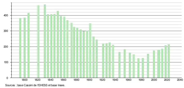 L'évolution du nombre d'habitants est connue à travers les recensements de la population effectués dans la commune depuis 1793. Pour les communes de moins de 10 000 habitants, une enquête de recensement portant sur toute la population est réalisée tous les cinq ans, les populations de référence des années intermédiaires étant quant à elles estimées par interpolation ou extrapolation[20]. Pour la commune, le premier recensement exhaustif entrant dans le cadre du nouveau dispositif a été réalisé en 2007[21].