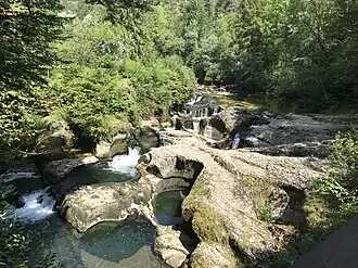 Les marmites de géant sont des cavités naturelles de 2 à 3 mètres de profondeur creusées depuis des millénaires par les galets et les tourbillons de la rivière. Elles sont parfois reliées par des cascades[2],[4],[1],[5].