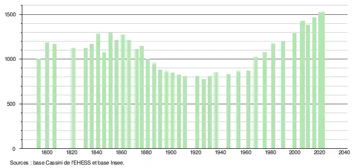 L'évolution du nombre d'habitants est connue à travers les recensements de la population effectués dans la commune depuis 1793. Pour les communes de moins de 10 000 habitants, une enquête de recensement portant sur toute la population est réalisée tous les cinq ans, les populations de référence des années intermédiaires étant quant à elles estimées par interpolation ou extrapolation[23]. Pour la commune, le premier recensement exhaustif entrant dans le cadre du nouveau dispositif a été réalisé en 2005[24].