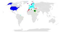 La zone en vert clair désigne le Sahara occidental (ex-« Sahara espagnol »), considéré comme un territoire non autonome par l'ONU[1] et majoritairement administré de facto par le Maroc, qui le revendique dans son intégralité, tout comme le Front Polisario.