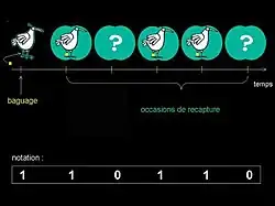 Notation : A chacune des occasions de capture, on regarde si l′individu était présent (codé "1" ) ou absent (codé "0"). Le code "0" peut signifier deux choses : soit la non-capture de l'individu, soit sa mort.