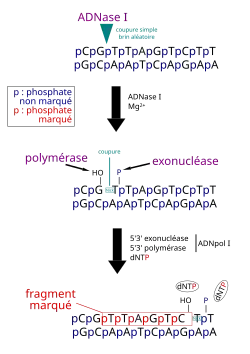 - l'endonucléase DNase I qui provoque des coupures simple brin au hasard sur l'ADN;