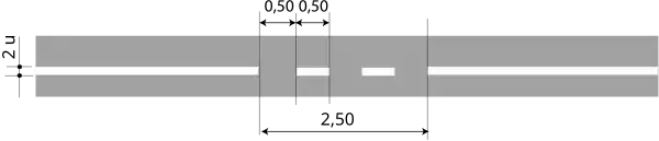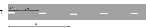 - lorsque la traversée de la chaussée n'est autorisée que dans un seul sens, la ligne longitudinale continue est doublée sur une longueur de 2,50m environ par une ligne T'2 de largeur 2u, implantée du côté de la voie à partir de laquelle la traversée est autorisée.