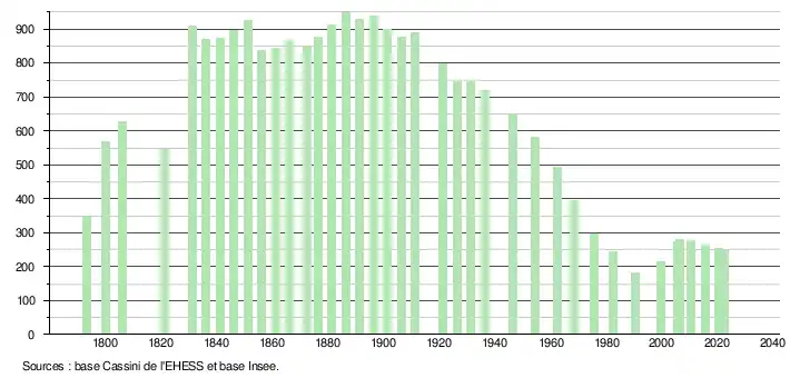 L'évolution du nombre d'habitants est connue à travers les recensements de la population effectués dans la commune depuis 1793. Pour les communes de moins de 10 000 habitants, une enquête de recensement portant sur toute la population est réalisée tous les cinq ans, les populations de référence des années intermédiaires étant quant à elles estimées par interpolation ou extrapolation[21]. Pour la commune, le premier recensement exhaustif entrant dans le cadre du nouveau dispositif a été réalisé en 2005[22].