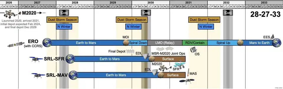 Les deux missions chargées de la suite du programme sont d'une part SRL, qui doit aller chercher les échantillons sur le sol martien (rover SFR) et les ramener sur une orbite martienne (fusée MAV), et d'autre part l'orbiteur martien ERO, qui doit assurer le support des opérations au sol (télécommunications) depuis l'orbite martienne, récupérer le conteneur renfermant les échantillons à la suite d'un rendez-vous en orbite martienne puis revenir sur Terre et larguer dans l'atmosphère terrestre la capsule contenant le conteneur. Cette dernière doit se poser en douceur sur un site terrestre sélectionné. La planification du projet constitue un des aspects les plus complexes de ces deux missions[14] :