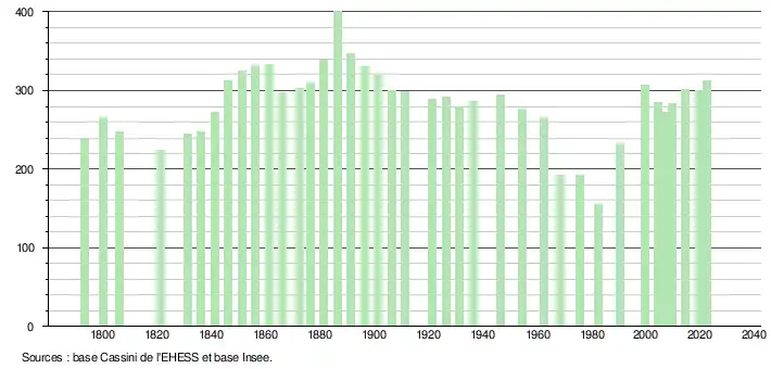 - ↑ Fiches Insee - Populations de référence de la commune pour les années 2006, 2007, 2008, 2009, 2010, 2011, 2012, 2013, 2014, 2015, 2016, 2017, 2018, 2019, 2020, 2021 et 2022.