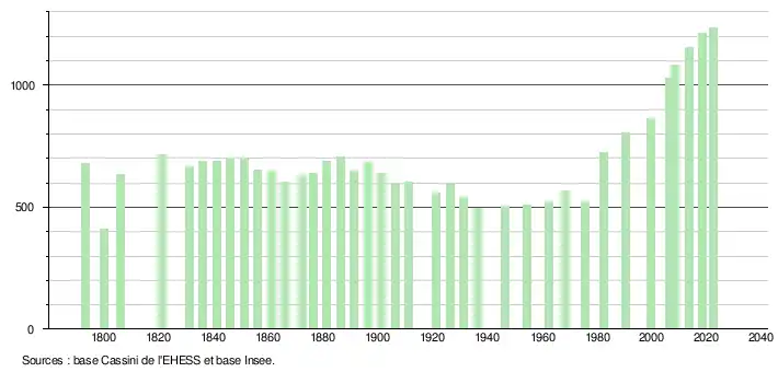 L'évolution du nombre d'habitants est connue à travers les recensements de la population effectués dans la commune depuis 1793. Pour les communes de moins de 10 000 habitants, une enquête de recensement portant sur toute la population est réalisée tous les cinq ans, les populations de référence des années intermédiaires étant quant à elles estimées par interpolation ou extrapolation[22]. Pour la commune, le premier recensement exhaustif entrant dans le cadre du nouveau dispositif a été réalisé en 2008[23].
