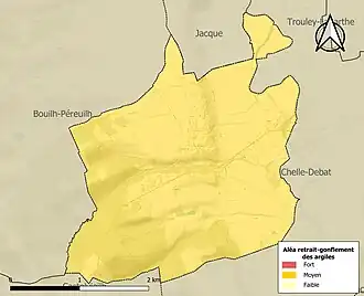 Le retrait-gonflement des sols argileux est susceptible d'engendrer des dommages importants aux bâtiments en cas d’alternance de périodes de sécheresse et de pluie. La totalité de la commune est en aléa moyen ou fort (44,5 % au niveau départemental et 48,5 % au niveau national). Sur les 124 bâtiments dénombrés sur la commune en 2019, 124 sont en aléa moyen ou fort, soit 100 %, à comparer aux 75 % au niveau départemental et 54 % au niveau national. Une cartographie de l'exposition du territoire national au retrait gonflement des sols argileux est disponible sur le site du BRGM[17],[Carte 2].