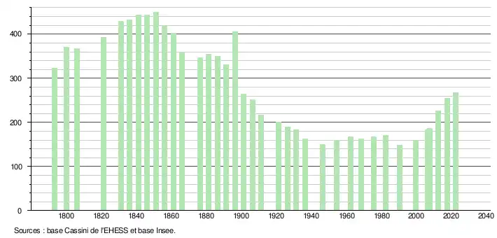 | L'évolution du nombre d'habitants est connue à travers les recensements de la population effectués dans la commune depuis 1793. Pour les communes de moins de 10 000 habitants, une enquête de recensement portant sur toute la population est réalisée tous les cinq ans, les populations de référence des années intermédiaires étant quant à elles estimées par interpolation ou extrapolation[23]. Pour la commune, le premier recensement exhaustif entrant dans le cadre du nouveau dispositif a été réalisé en 2007[24]. En 2022, la commune comptait 267 habitants[Note 4], en évolution de +7,23 % par rapport à 2016 (Hautes-Pyrénées : +1,59 %, France hors Mayotte : +2,11 %). |