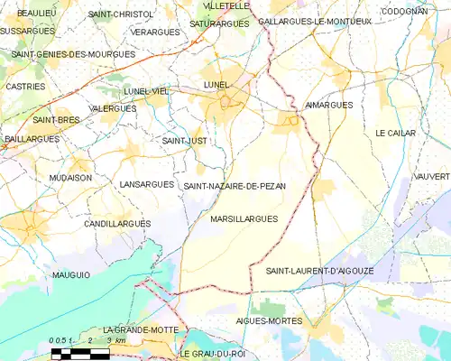- ↑ Dans cette commune proche du littoral et de l'étang de l'Or, la plaine méridionale se situe entre 1 et 2 mètres d'altitude d'après la carte topographique Aigues-Mortes, n°2843 OT, Institut géographique national, 2e édition, 2000. 0 mètre correspond à la partie submersible de l'étang de l'Or situé au sud-ouest du territoire communal (entre le canal de Lunel et la pointe de la Radelle (quadripoint avec Aigues-Mortes, La Grande-Motte et Mauguio) et aux rives les plus méridionales du canal de Lunel, du canal du Rhône à Sète et du Vidourle.