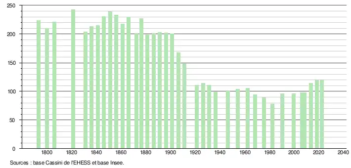 L'évolution du nombre d'habitants est connue à travers les recensements de la population effectués dans la commune depuis 1793. Pour les communes de moins de 10 000 habitants, une enquête de recensement portant sur toute la population est réalisée tous les cinq ans, les populations de référence des années intermédiaires étant quant à elles estimées par interpolation ou extrapolation[21]. Pour la commune, le premier recensement exhaustif entrant dans le cadre du nouveau dispositif a été réalisé en 2008[22].