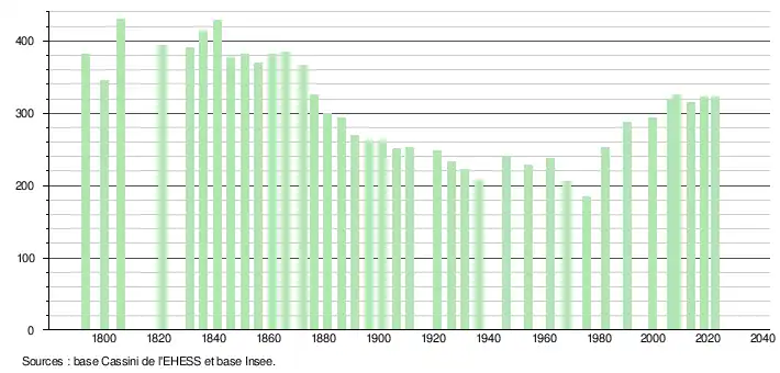 L'évolution du nombre d'habitants est connue à travers les recensements de la population effectués dans la commune depuis 1793. Pour les communes de moins de 10 000 habitants, une enquête de recensement portant sur toute la population est réalisée tous les cinq ans, les populations de référence des années intermédiaires étant quant à elles estimées par interpolation ou extrapolation[22]. Pour la commune, le premier recensement exhaustif entrant dans le cadre du nouveau dispositif a été réalisé en 2008[23].