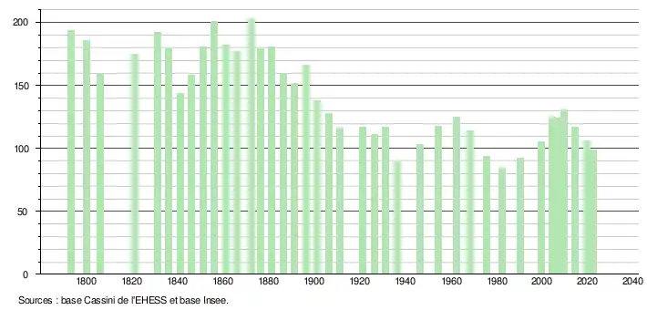 L'évolution du nombre d'habitants est connue à travers les recensements de la population effectués dans la commune depuis 1793. Pour les communes de moins de 10 000 habitants, une enquête de recensement portant sur toute la population est réalisée tous les cinq ans, les populations de référence des années intermédiaires étant quant à elles estimées par interpolation ou extrapolation[22]. Pour la commune, le premier recensement exhaustif entrant dans le cadre du nouveau dispositif a été réalisé en 2004[23].
