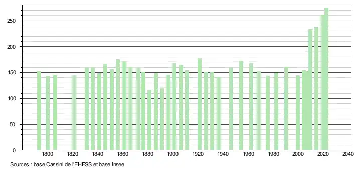 L'évolution du nombre d'habitants est connue à travers les recensements de la population effectués dans la commune depuis 1793. Pour les communes de moins de 10 000 habitants, une enquête de recensement portant sur toute la population est réalisée tous les cinq ans, les populations de référence des années intermédiaires étant quant à elles estimées par interpolation ou extrapolation[21]. Pour la commune, le premier recensement exhaustif entrant dans le cadre du nouveau dispositif a été réalisé en 2004[22].