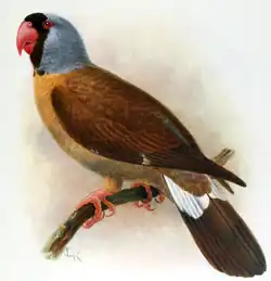On trouve le mascarin à l'île de Bourbon ; j'en ai vu plusieurs vivants à Paris ; c'étaient des oiseaux assez doux ; ils n'avaient en leur faveur que leur bec rouge qui tranchait agréablement sur le fond sombre de leur plumage ; ils n'avaient pas appris à parler[26].