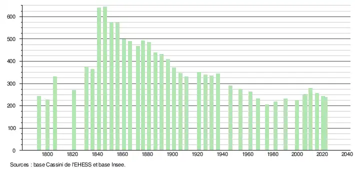 L'évolution du nombre d'habitants est connue à travers les recensements de la population effectués dans la commune depuis 1793. Pour les communes de moins de 10 000 habitants, une enquête de recensement portant sur toute la population est réalisée tous les cinq ans, les populations de référence des années intermédiaires étant quant à elles estimées par interpolation ou extrapolation[42]. Pour la commune, le premier recensement exhaustif entrant dans le cadre du nouveau dispositif a été réalisé en 2005[43].